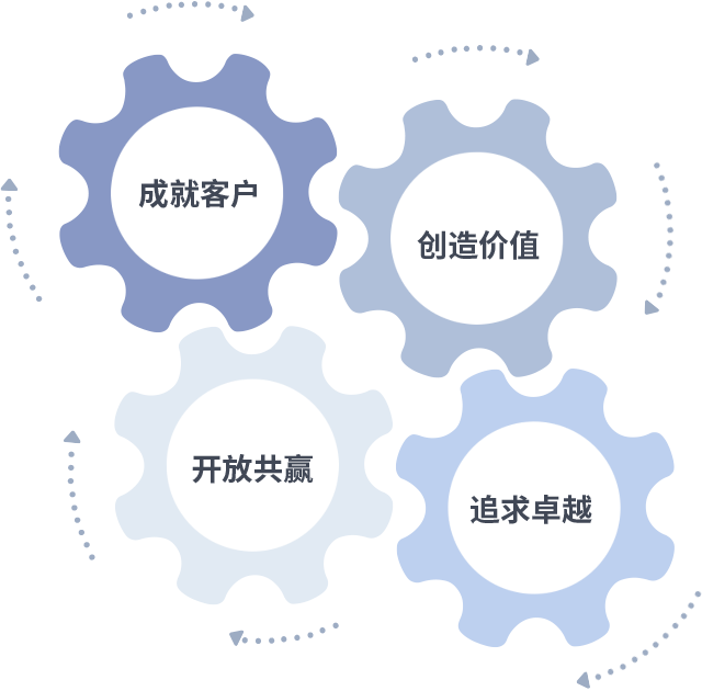 成就客户是一切决策的出发点,,创造价值是衡量所有工作的标准,,,,追求卓越是我们做事做人的态度,,,开放共赢是我们的格局也是最终的结果。。。价值观的齿轮环环相扣,,推动着组织里的每个人不断向前。。。
